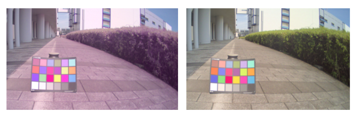 IMX775成像对比 (左)未启用NIR分量去除算法 (右)启用NIR分量去除算法 (以上示例图仅供参考)